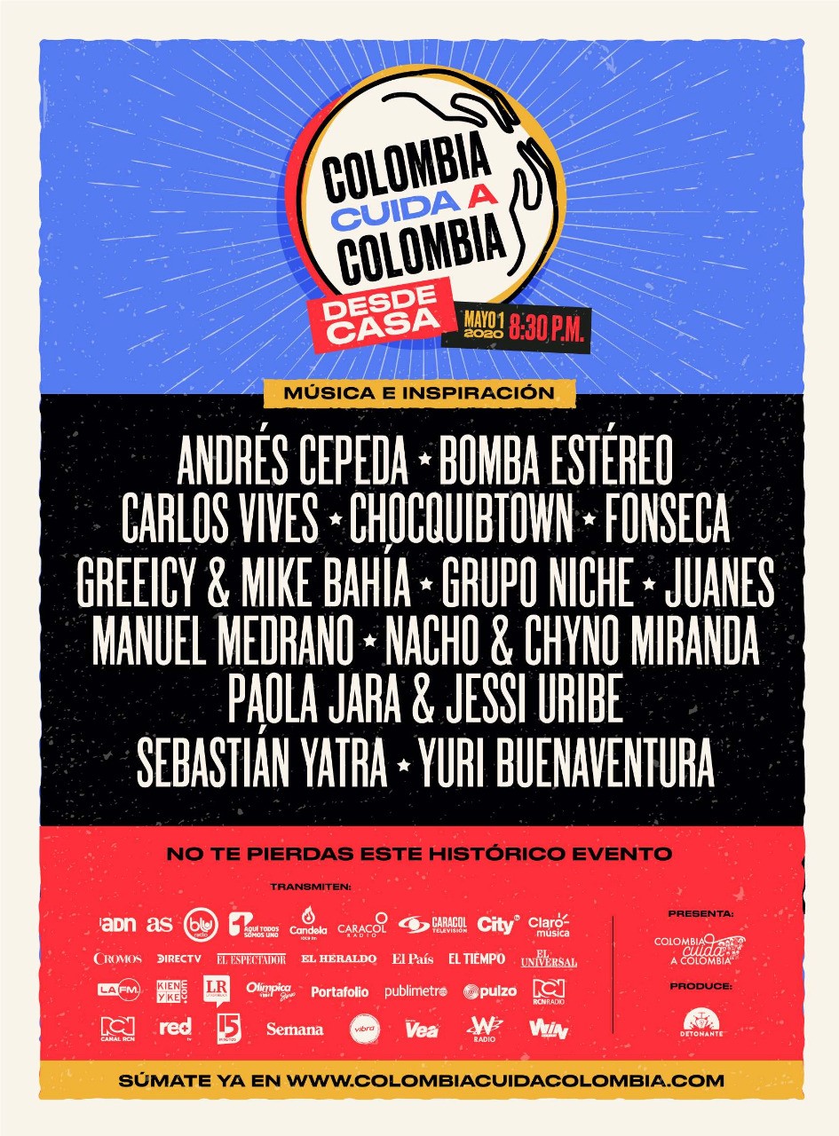 Este 1 de mayo y con el apoyo de medios de comunicación se realizará una transmisión conjunta que busca movilizar a todo un país para recoger más donaciones y llevar ánimo y aliento a todos los colombianos. El Concierto se transmitirá a partir delas 8:30 pm en simultánea por Bluradio, Caracol Radio Caracol TV , WIN TV, Canal 1, CItyTV, RCN TV, RCN Radio, El Tiempo, El Espectador, La República, Pulzo, Red Más, Semana y otros que pronto serán aliados.