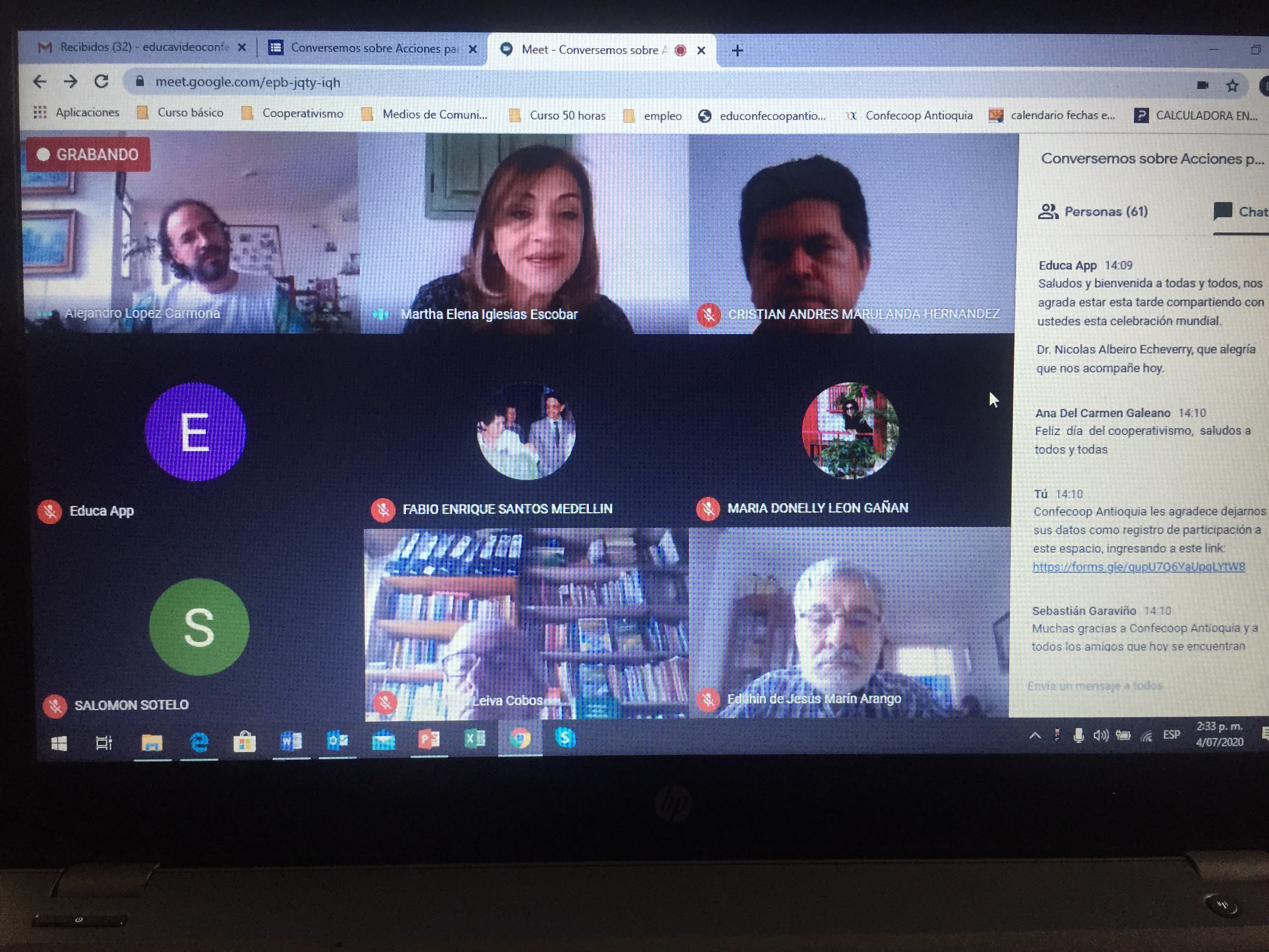 La Asociación Antioqueña de Cooperativas, Confecoop Antioquia en el marco del Día Internacional del Cooperativismo, que desde hace 97 años se viene celebrando. Para este año 2020, el lema entregado por la Alianza Cooperativa Internacional – ACI fue en torno a las “cooperativas y su acción por el cambio climático”; fue así como el sábado 4 de julio, se propició este espacio de conocimiento, mediante un conversatorio virtual que contó con la participación de 61 personas, en las que se discutieron algunas reflexiones a cargo de actores del sector cooperativo, en torno a acciones que crean conciencia sobre el cuidado del medio ambiente y el aporte, desde la labor de las cooperativas para cuidarlo.